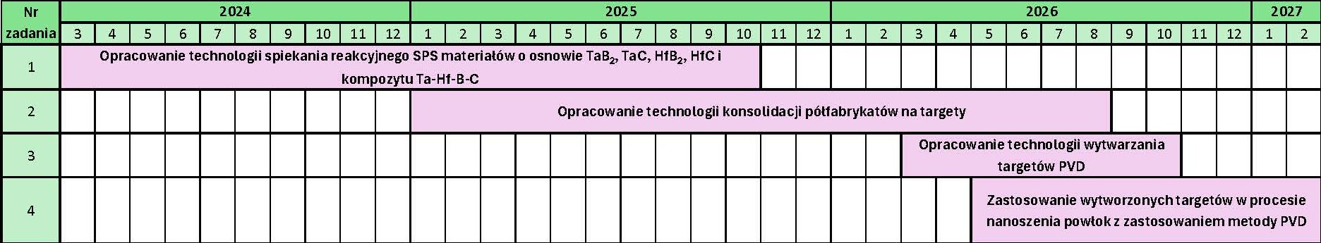 Wyzwaniem podjętym w ramach tego zadania jest opracowanie technologii wytwarzania materiałów o wymiarach umożliwiających wykonanie targetów do urządzeń PVD. Zadanie dotyczy przeskalowania technologii wytwarzania materiałów z zastosowaniem RSPS ze skali laboratoryjnej do skali umożliwiającej konsolidację materiałów o wymiarach pozwalających na ich praktyczne zastosowanie. W ramach zadania przeprowadzone zostaną procesy spiekania półfabrykatów na targety tj. dysków o średnicy do 80mm i wysokości do 10mm.